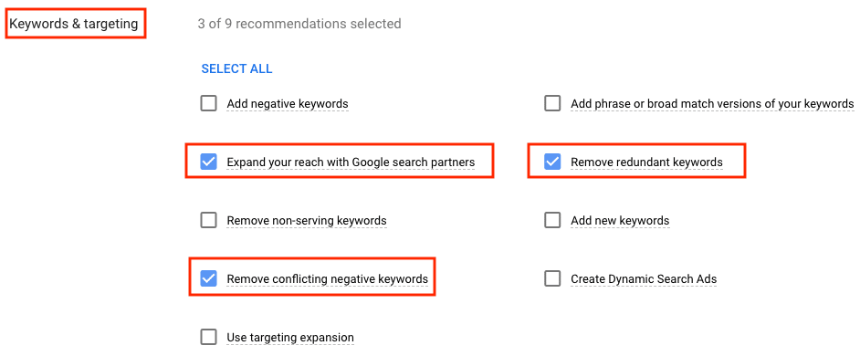 These settings allow Google Ads to automatically apply “optimizations” to your account, often without clear notification which can impact spend, targeting, and performance. What is sold as a helpful way to improve account management efficiency can absolutely destroy your carefully curated and managed ad account if you don’t turn these off.
